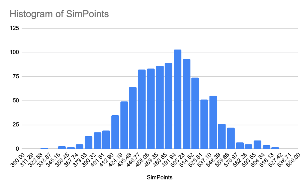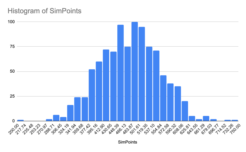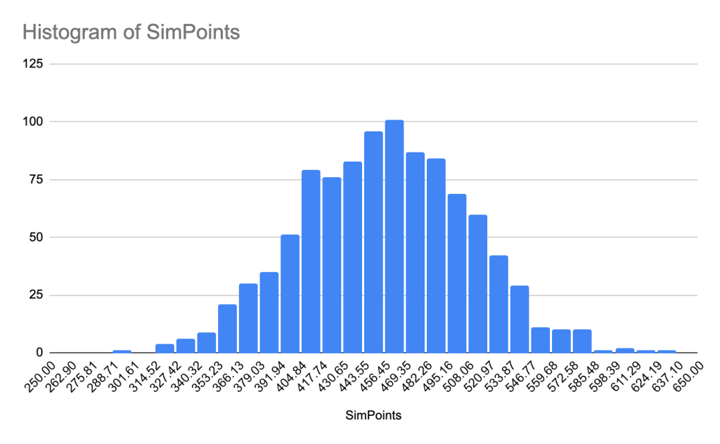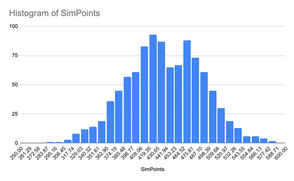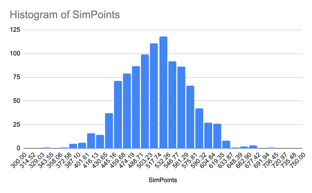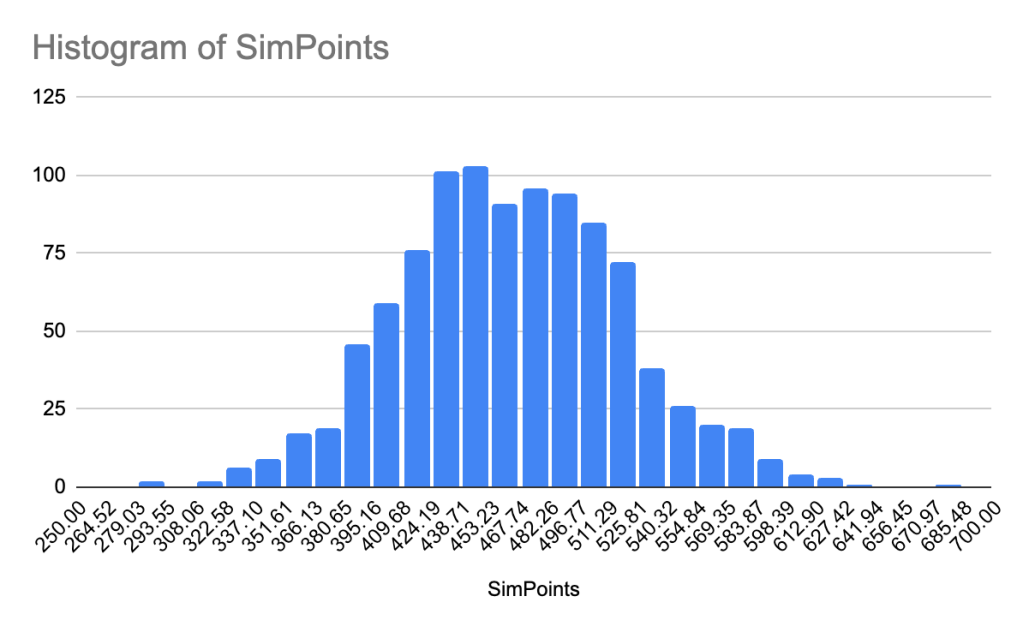 Now that I’ve been able to have the time to work on bigger projects and dig deeper analytically, I do have new ideas and concepts to share. Over the past month I’ve really gotten into the idea of building ranges of outcomes for every hitter and pitcher, then putting together histograms for players that I’ve come up with on my own. I can share from my projections that I have made adjustments up and down for players where I’ve seen it necessary, in order to create more believable and accurate outcomes. For the most part, I try as much as possible not to mess with projections for players where I feel their projection is already really good and spot on. The players I adjusted for here are Guerrero, who I felt needed a projection boost considering points leagues are his clear strong suit. He’s earned a projection over 500 points with his consistent production throughout his career. I lowered the projection for Kurtz because I felt it was appropriate, but you’ll see he still has the second highest projection.